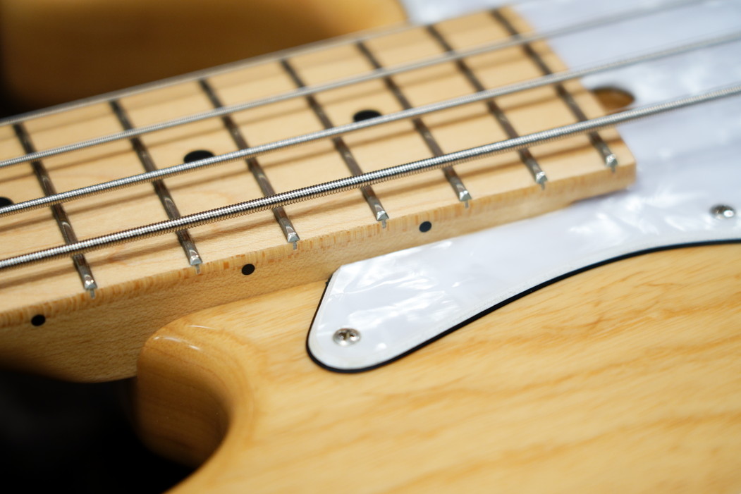 白いポジションマークとピックガードがちょっと優しい雰囲気で、指弾きから、ピック弾きまで、幅広く対応してくれるタイプ。
