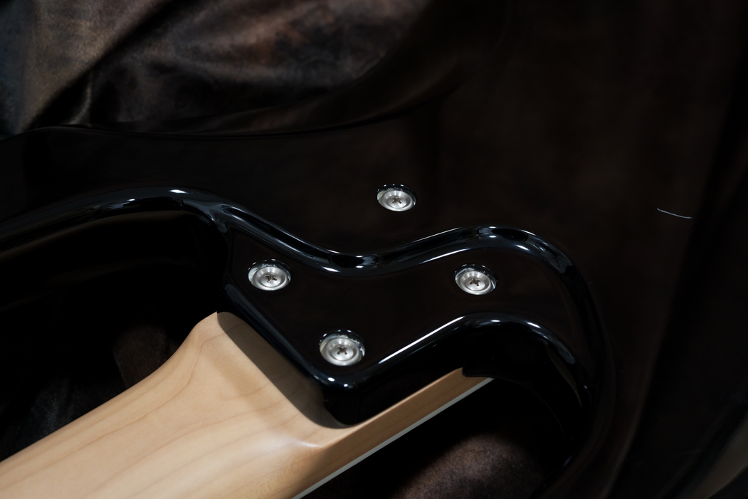 こちらにネックはメイプルの指板はローズウッドのブロックポジションにセルバインディング付きの豪華仕様。