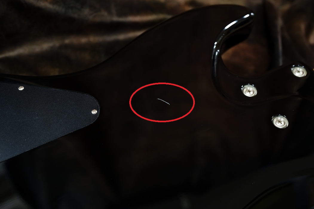 中古の状態は大きな打痕などございませんが、ボディバックに大きな削れがありまして、下地が見えています。