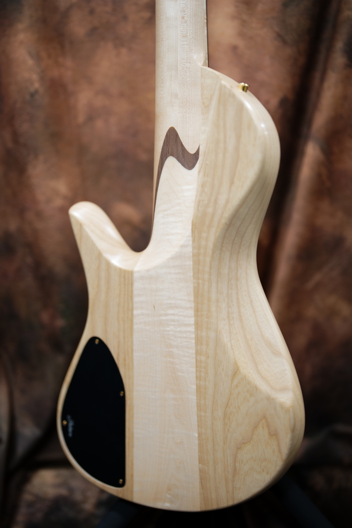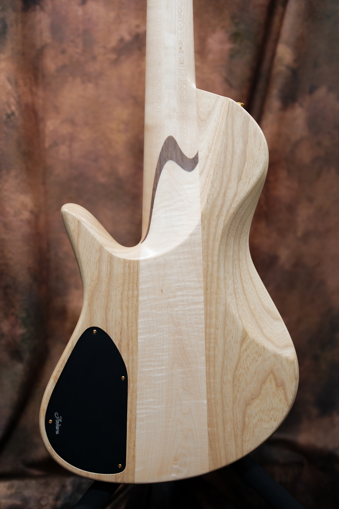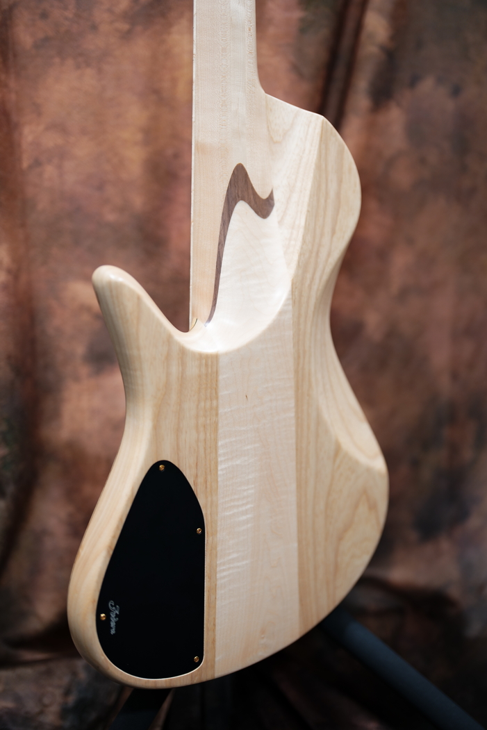 バックにいきますとボディは定番のアッシュにセンターはフレイムメイプル。